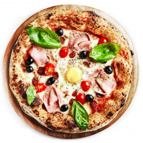 Sauce tomate, mozzarella, merguez du boucher, jambon et 1 œuf.