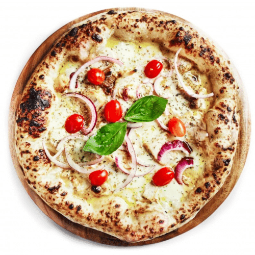 Sauce tomate, mozzarella, thon, tomates cerises, olives noires, oignons rouges.