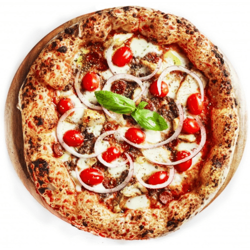 Sauce tomate, mozzarella, haché de bœuf, poulet mariné, merguez du boucher, tomates cerises et oignons rouges.